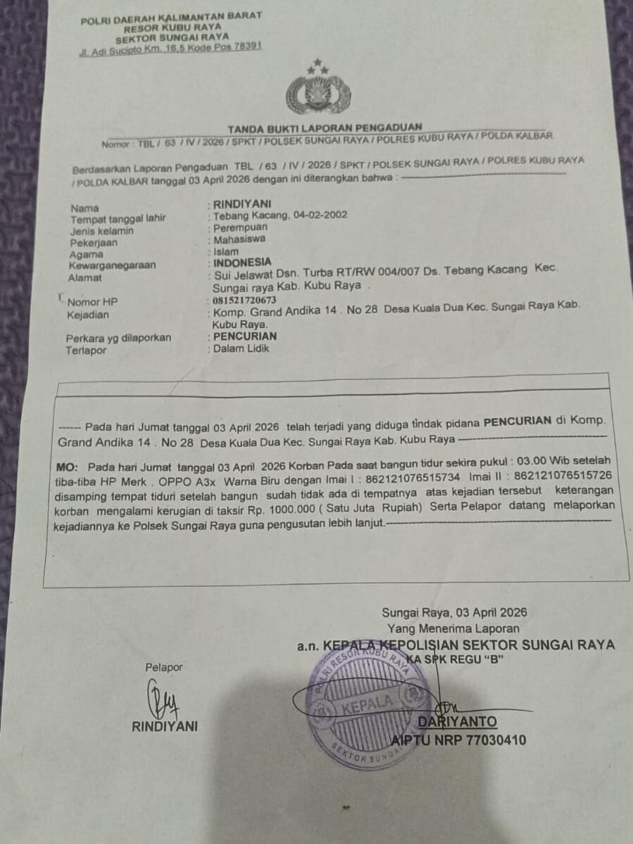 Kubu Raya – Aksi kriminalitas menyasar kawasan pemukiman di Desa Kuala Dua, Kecamatan Sungai Raya. Seorang mahasiswa berinisial RY menjadi korban pencurian setelah pelaku misterius membobol rumahnya di Komplek Grand Andika, Jalan Alas Kusuma, pada Jumat (03/04/2026) dini hari sekitar pukul 03.00 WIB.