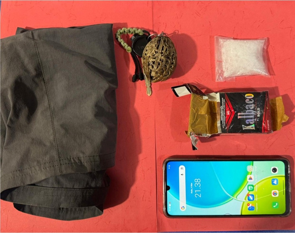 Saat dilakukan pemeriksaan badan, petugas menemukan satu bungkus rokok merek Kalbaco yang dililit lakban kuning di saku celana depan sebelah kiri. Selain itu, petugas juga mengamankan satu unit telepon genggam merek Vivo warna hijau metalik dari saku celana depan sebelah kanan pelaku.